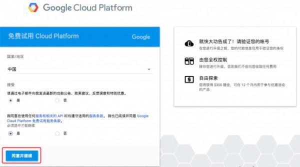 注册谷歌云账号类型尽量选择个人,个人资料和信用卡信息填写完成之后直接点击开始免费试用选项即可。