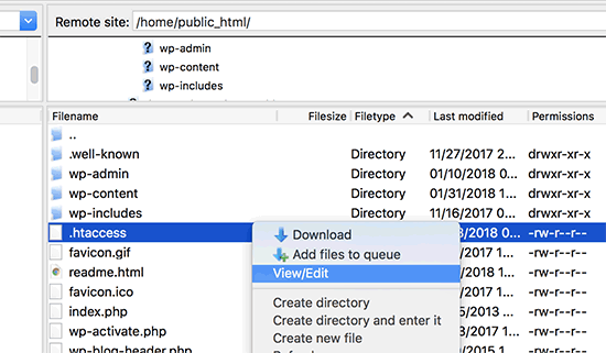 连接后,.htaccess文件将位于您将看到wp-content,wp-admin和wp-includes等文件夹的同一目录中。