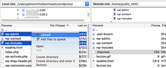 在左侧列中打开计算机上的WordPress文件夹。现在您需要选择wp-includes和wp-admin文件夹,然后右键单击并选择“上传”。