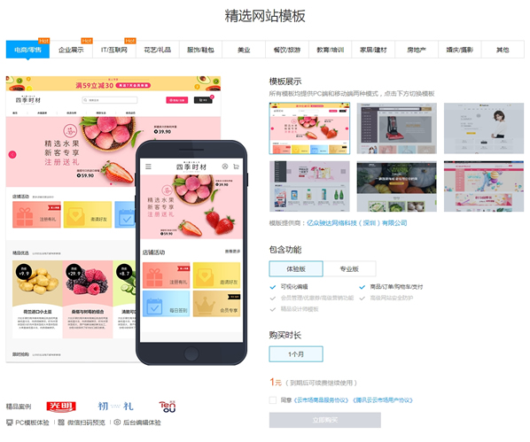 腾讯云推出了海量建站模板活动,pc和移动端模板仅1元购买。让企业更低的成本进入云端建站。模板主要包括电商、零售、餐饮、外卖、企业展示、教育 、美业、房产、服装、汽车、旅游等热门行业小程序模板。