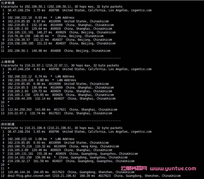 联通回程线路走的是AS9929的联通优化线路,并且都是直连的。