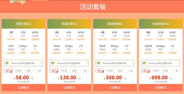 1.香港1核2G 1核 CPU Xeon E5 2GB 内存 DDR4 40GB 系统盘 ¥998元/年