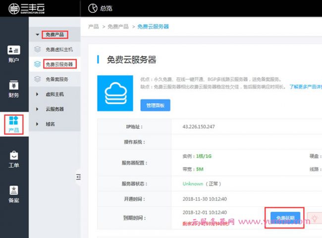 三丰云免费服务器如何免费延期?登录控制台,依次点击:产品>>免费云服务器>>免费延期,您将看到如下图,根据提示进行操作即可进行免费延期:
