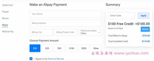 注意:必须通过上述地址注册方可得到免费的100美元,新用户注册后,使用支付宝、PAYPAL或信用卡充值10美元,即可得到额外的免费的100美元,如图: