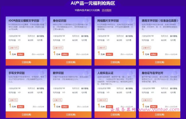 16款AI技术接口1元抢购:iOCR自定义模板文字识别、身份证识别、网络图片文字识别、通用文字识别、手写文字识别、数字识别、人脸实名认证、身份证与名字比对、人脸属性编辑、地址识别等等。