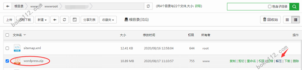 3. 将压缩包 wordpress.zip 上传到 WordPress 站点根目录,如通过宝塔面板的文件管理上传,然后将该压缩包解压到当前路径覆盖原文件。