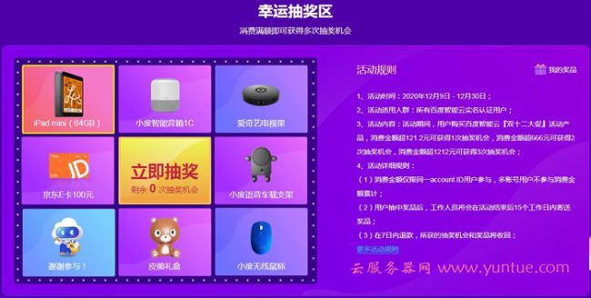 此外,还有幸运抽奖活动等你来。活动期间,用户购买百度智能云『双十二大促』活动产品,消费金额超121.2元可获得1次抽奖机会,消费金额超666元可获得2次抽奖机会,消费金额超1212元可获得3次抽奖机会。