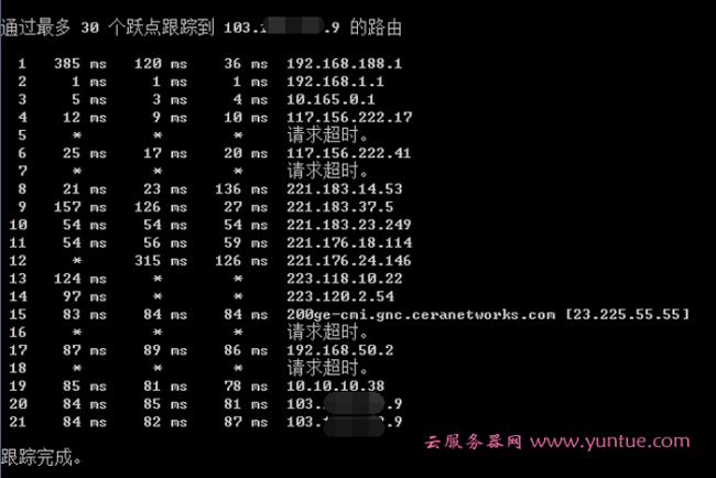 硅云服务器到底怎么样?这台服务器是哥哥拥有的第一台香港区域的服务器。这台云服务器的购买使命是用来挂机和做任务采集,所以第一次选择了win2012 64位中文版操作系统,使用过程中远程桌面连接时长掉线,操作比较卡顿,怀疑是路由节点过多导致,用tracert命令跟踪,果不其然,最多需要30个节点(本次测试是移动网络,时间经过了21个路由节点)访问到目标服务器路由节点。