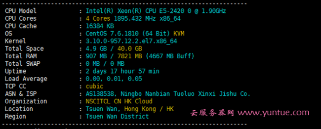 运行时长:2 days 17 hour 57 min ,可以看到这台服务器的在线时长是2天17小时多点,也就是说是我的新服务器啦。