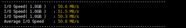 经过3次读写测试,我们可以看到,这台香港云服务器的3次磁盘I/O测试结果分别为:50.6MB/s、51.5MB/s、50.3MB/s,三次平均读写速度50.8 MB/s 。这个速度确实比大品牌的低很多,如果对硬盘读写要求高的朋友,就要慎重了。