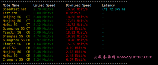 从图中的可以看到上传速度最高是合肥的中国电信,可以达到5.12Mbit/s,最低是南京的移动线路0.36Mbit/s。下载速度最高是广州联通19.46 Mbit/s,最低的是广州电信1.08 Mbit/s 。总体来看硅云服务器对移动线路的支持不好,对联通线路的支持比较稳定。