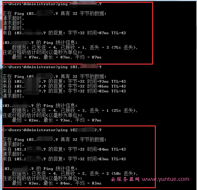 ping测评是在win7旗舰版32位系统、移动线路下进行,连续ping了三次目标服务器,丢包率最高75%,最低25%;平均响应时长最高87ms,最低83ms;这就说明硅云香港节点的云服务器在移动线路丢包率比较高,和上面的网络性能测试结果一致。
