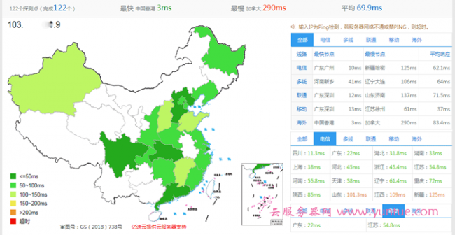 为了保证测评的质量不受本机所在地域及运营商线路影响,再次运用站长工具提供的ping测评工具进行测速,结果如下图所示,供大家参考: