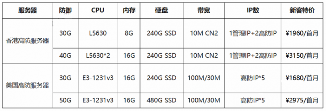 香港/美国高防服务器是基于先进的全球攻击智能侦测与清洗系统,DDoS 防御高达 300G,无惧 CC,弹性升级,具体配置及价格详见下表: