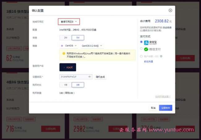 这里根据我们实际的产品选择,我这里选择香港可用区B,香港2核4G5M的云服务器价格:2308.82元/3年,比同等配置国内云服务器贵了840元,平均一年贵280元/年。