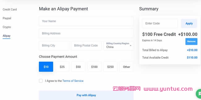 我们可以看到支持信用卡、支付宝、Paypal等付款方式。但是需要充值10美金作为激活账户,不会直接送的。需要注意的是暂时不支持微信充值,笔者已经试过了,见下图: