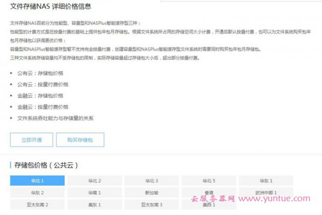 3、以华北1公共云分区,性能型存储包的起步为5GB,1个月起步价为2月,6个月为9.96元,一年为18元;容量型存储包起步为500GB,1个月起步价为150元,一年为1350元;NAS Plus 智能缓存型存储包,500GB起步,1个月的起步价为380元,1你哪的起步价为3420元;