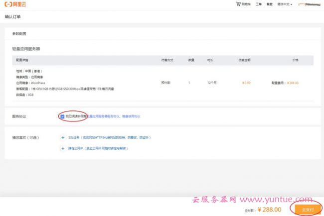 以上生成了确认订单页面,我们选择了年付288元/年,可以看到轻量应用服务器的详细配置和资料,我们点击“服务协议”勾选,然后点击“去支付”按钮。