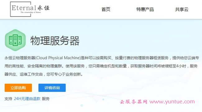 永恒云物理服务器怎么样?永恒云物理服务器(Cloud Physical Machine)是种可以按需购买、按量付费的物理服务器租赁服务,提供给您云端专用的高性能、安全隔离的物理集群。使用该服务,您只需确定机型和数量,获取服务器时间将被缩短至4小时,服务器供应、运维工作交由,您可专心于业务创新。