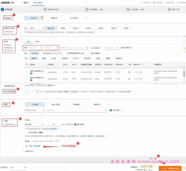 3.勾选需要购买的云服务器相关配置,比如:付费模式、地域及可用区、实例、购买实例数量、镜像、存储等信息。