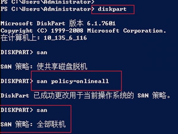 • 自定义镜像中的 SAN 策略为onlineAll