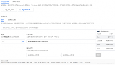 4.第一次使用是会默认安全组,接着设置登陆方式。可以直接设置密码通过本地计算机远程桌面连接或者设置ssh密钥,通过支持ssh的工具来访问服务器,这里直接用本地计算机远程桌面连接,比较方便。