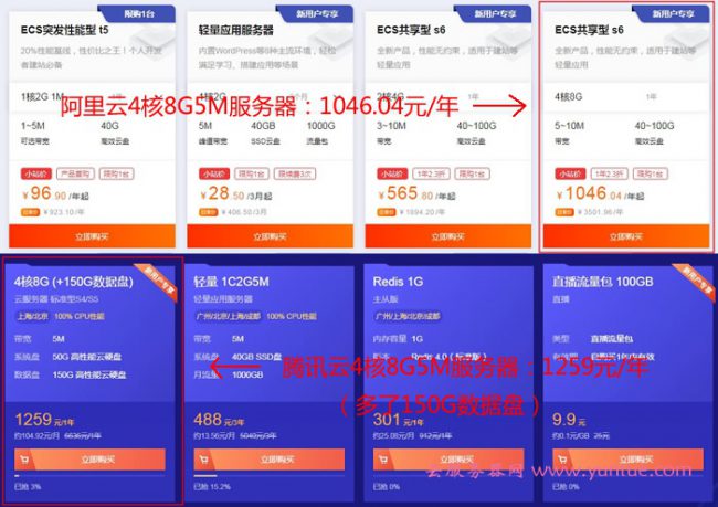 3、虽然活动中,阿里云4核8G5M云服务器比腾讯云便宜200元左右,但是只可以买1年,腾讯云可以买3年。还有腾讯云增加了150G数据盘,如果额外购买又是一笔不小开支呢。