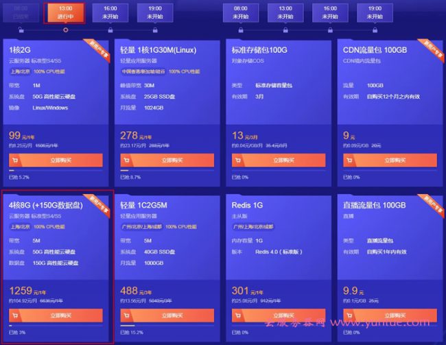 腾讯云在4核8G云服务器有一个限时秒杀活动,我们可以选择时间占在13:00-16:00这个区间,可以看到第二行第一位的方格中,腾讯云标准型S4/S5 4核8G5M(+150G数据盘),价格1259元/年。不同的是,腾讯云这款云服务器比阿里云多了150G数据盘,还有可以选择3年。<<点击进入购买地址