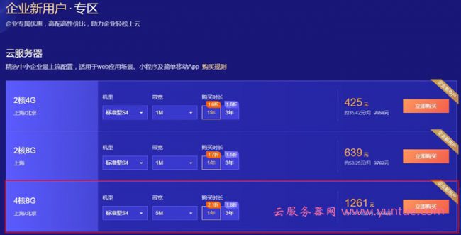 如果你是腾讯云企业新用户,可以拉到下方可以看到“企业新用户·专区”,下面腾讯云专门为企业用户提供精选了中小企业主流配置,适合web应用场景、小程序及简单移动APP。下面4核8G5M云服务器可以选择标准型S4或S5,S4可以选上海、北京二个地区,S5只可以选择北京地区,价格:1261元/年,3242元/3年。<<点击进入购买地址