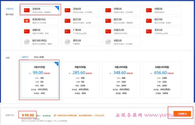 1、深圳2区:深圳BGP多线,存储强化 4核(CPU) 8G(内存) 5M(带宽) 40G(磁盘) 1个月 x 1台(购买量),价格:99元/月,1188元/年 <<点击购买