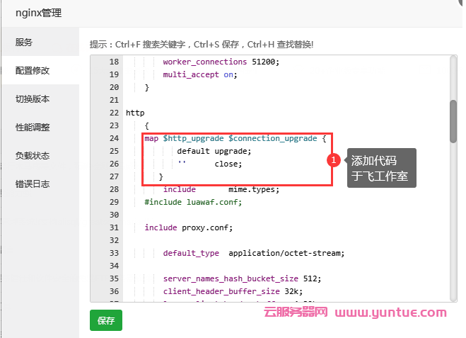 如果 Upgrade 标头设置为 ‘’,此 map 块告诉 nginx 正确设置相关的 Connection 标头来关闭连接。 将 map 块放入 nginx 配置的 http 块中。 nginx 配置的默认文件路径是 /etc/nginx/nginx.conf 。
