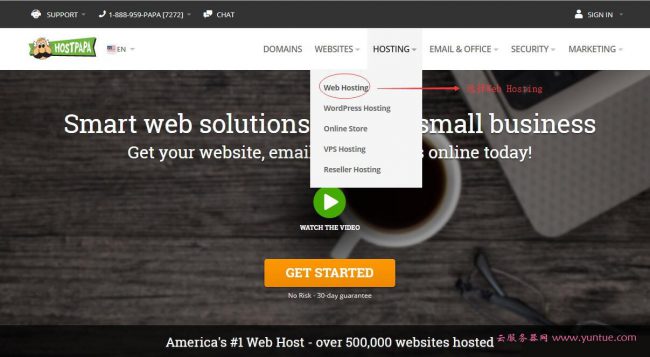 首先,通过HostPapa的最新优惠链接进入其官网首页,然后选择“Web Hosting”,如下图所示: