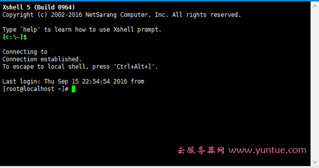 6.当黑色界面上出现[root@*******(每台服务器都不一样) ~]#的时候就表示连接成功了。