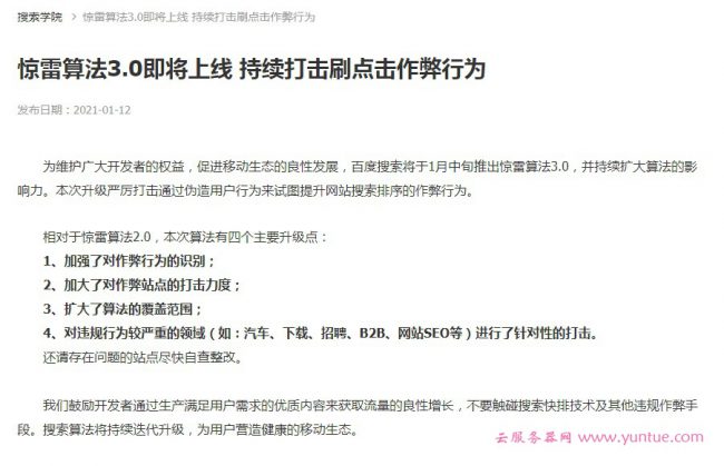 为维护广大开发者的权益,促进移动生态的良性发展,百度搜索将于1月中旬推出惊雷算法3.0,并持续扩大算法的影响力。本次升级严厉打击通过伪造用户行为来试图提升网站搜索排序的作弊行为。