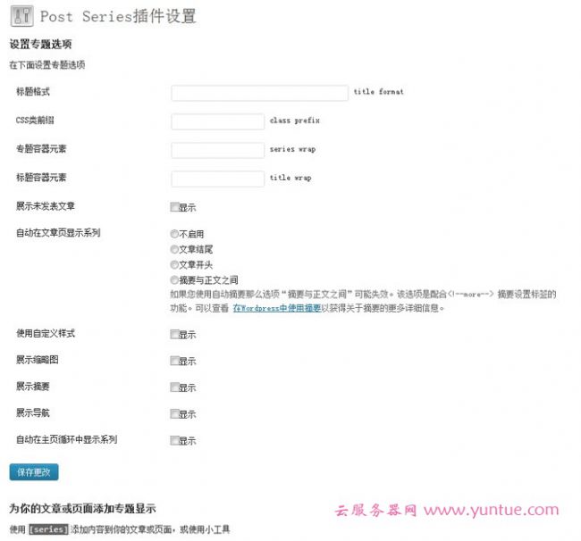 1.后台搜索 Simple Post Series 安装,启用插件后,要先访问 设置 – Post Series 专题,进行相关设置(设置样例)