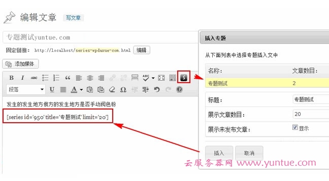 3.写文章时,可以点击可视化下的专题按钮,插入文章专题