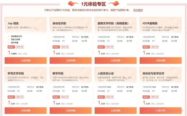 16款云产品限时1元体验,限活动期间注册并实名的用户参与,每款产品限购1单。