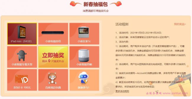 活动期间,用户购买本活动产品(不含度目智能硬件产品),可最多获得3次抽奖机会,消费金额超88元可获得1次抽奖机会,消费金额超666元可获得第2次抽奖机会,消费金额超2021元可获得第3次抽奖机会。