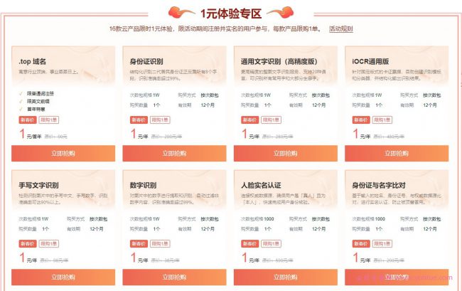 活动期间,完成实名认证立享1元抢购,身份证识别,通用文字识别(高精度版),手写文字识别、人脸实名认证、身份证与名字比对、地址识别、情感倾向分析等多款产品任意选!16款云产品限时1元体验,限活动期间注册并实名的用户参与,每款产品限购1单。