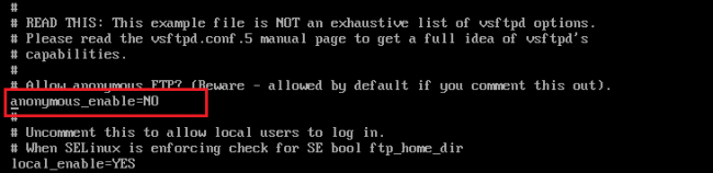 按 “i” 或 “Insert” 切换至编辑模式,将文件中的anonymous_enable=YES改为anonymous_enable=NO。如下图所示: