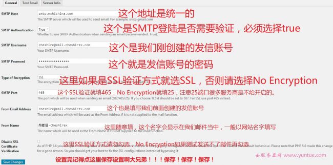 创建好我们回到wordpress插件配置界面,打开SMTP插件,根据我下图填写信息