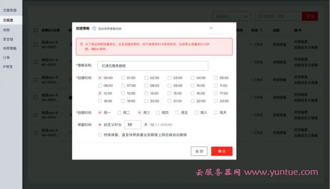 亿速云提供的“免费快照”服务,操作简单、安全好用,可以定时自动将您的服务器的数据进行备份,并支持用户随时根据需求,恢复之前某一时间点的数据。
