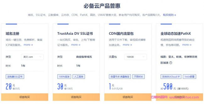我们还可以看到UCloud服务商还有云产品优惠,比如新注册.COM域名20元、CN域名10元。当然这些都需要领券的。