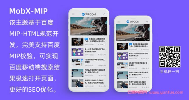MobX-MIP是一套专门针对百度MIP规范开发的wordpress手机主题,可完美通过百度MIP代码校验工具校验。目前百度对支持MIP规范的网页在移动端搜索结果里面会有一个闪电图标(百度最新规则已经下线闪电图标展示),可实现更大的点击转化率,配合熊掌号使用也可以实现更好的优化效果。