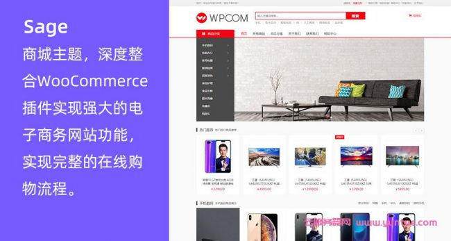 wordpress商城主题:woocommerce商城主题-Sage主题是一款专为在线商城网站而开发的WordPress主题,商城核心功能基于WooCommerce插件开发实现。WooCommerce插件是一个成熟的电子商务插件,广泛应用于wordpress电子商务类站点,目前安装量超过四百万,并且支持中文,插件介绍可以点击此处查看。
