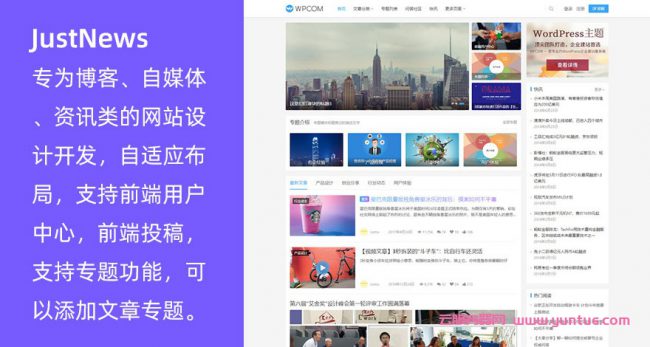 JustNews主题是一款专为博客、自媒体、资讯类的网站设计开发的wordpress主题,一个主题可以变换二种不同的风格,适合个人网站、自媒体博客、资讯类型网站。JustNews主题自3.0版开始支持自主研发的前端用户中心,不仅支持注册、登录、账户设置、个人中心等常用页面的添加,还可以上传头像、设置用户分组。