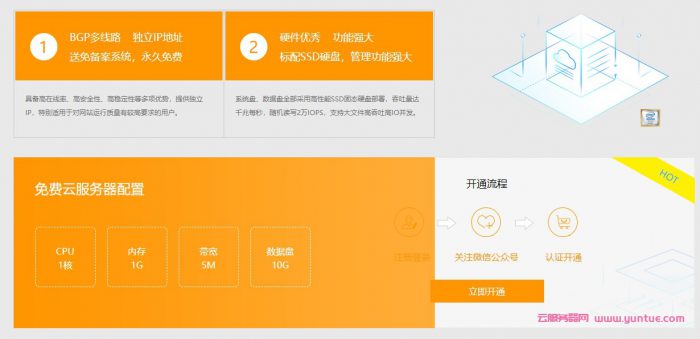 免费云服务器配置:CPU:1核/内存:1G/5M带宽/10G数据盘