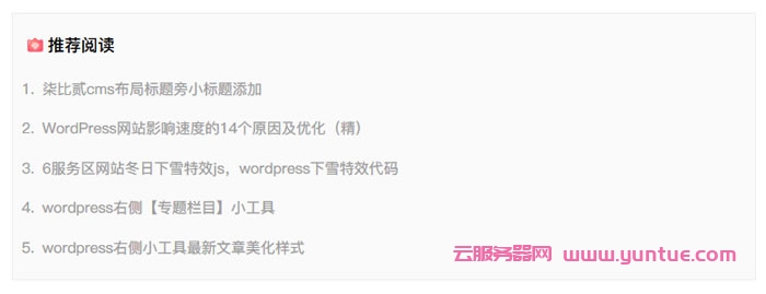 因为,有部分网友来问我云服务器网(yuntue.com)文章底部有一个推荐阅读那个样式怎么操作的,问的多了,我自己也难得去挨个的说,直接发文章教程吧!