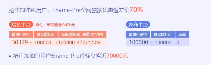 易名“抢注加油包”让你用更低的价格获得心仪的域名。全网仅在易名平台拥有抢注加油包的用户,就能享受Ename-Pre类型域名竞价得标70%超高额的返现。