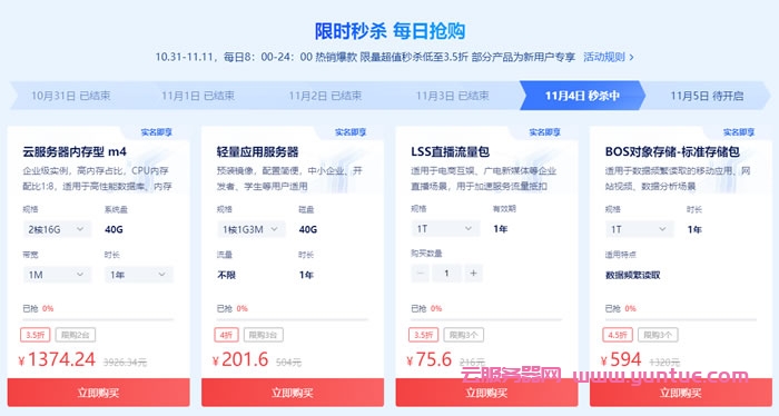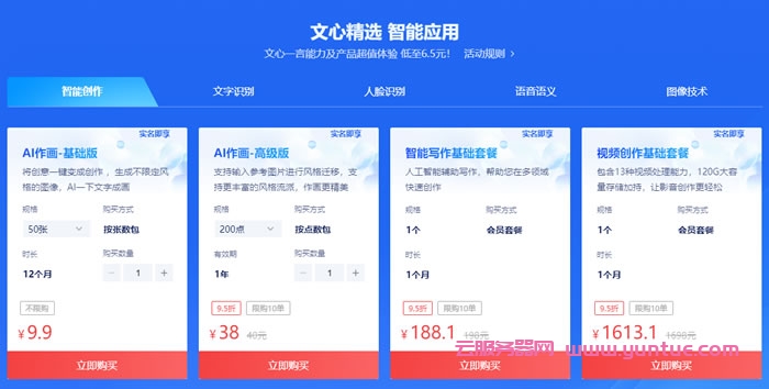 百度智能云11.11智惠上云节开始了!百度智能云文心产品1元体验,云服务器低至3.5折起,热销智能云产品专享好价低至1元,云服务器续费优惠低至4.2折起。百度智能云赠送400元新用户专享券,6200元企业实名用户福利券,2550热销产品券等。百度智能云应用服务器低至201.6元/年起,LSS直播流量包1T仅75.6元起,通用文字识别仅32.5元/年起。